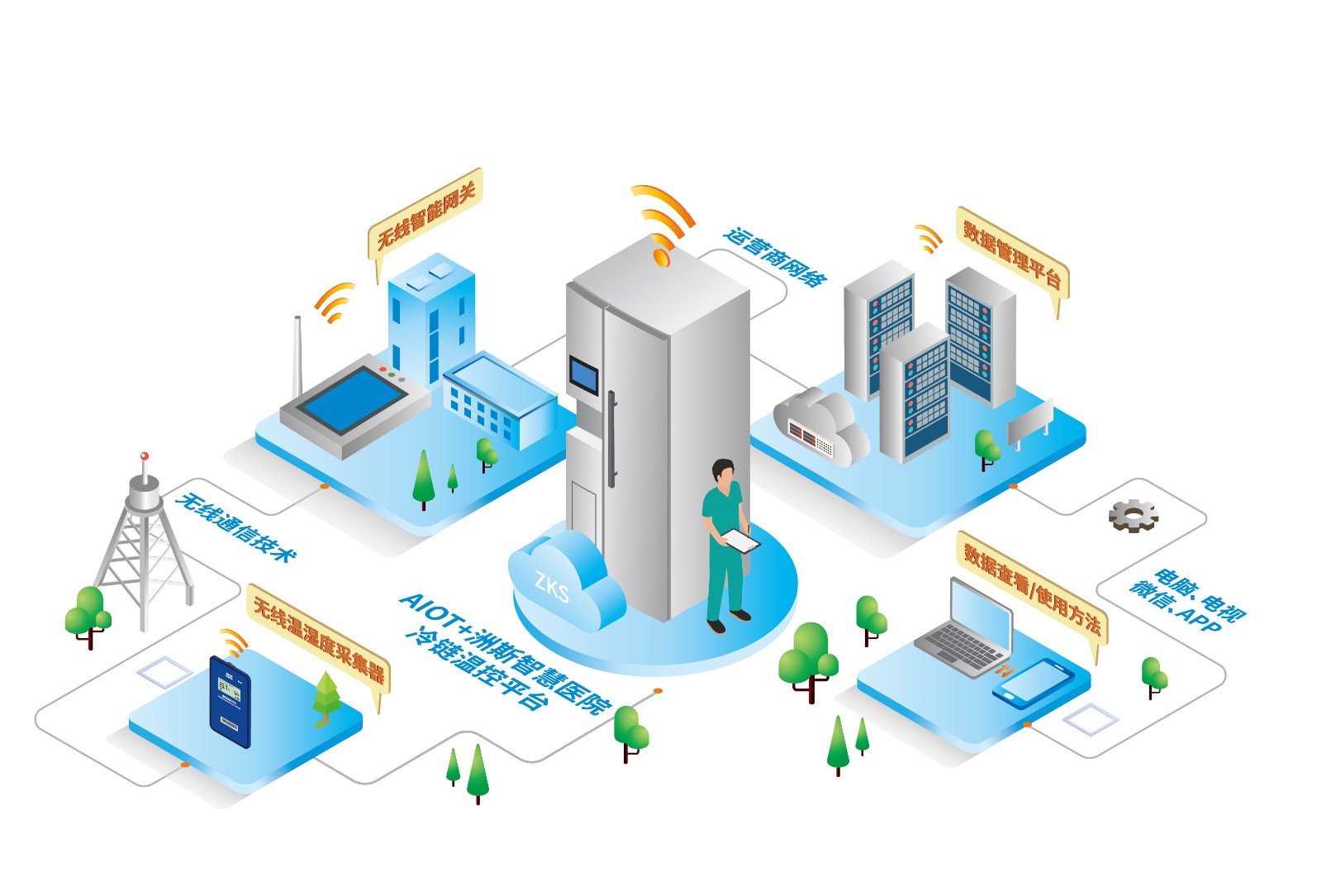 洲斯通過在醫院部署無線溫濕度記錄儀,采集各科室的冷藏冷凍設備的溫濕度數據,傳輸給洲斯物聯網關,在上 傳到醫院物聯網冷云監控平臺,一旦發生異常超溫,系統會通過多種方式逐級報警給相關責任人進行處置,防止 變質,減少損耗,為藥品在可靠溫濕度環境存儲的持續改善提供科學依據。