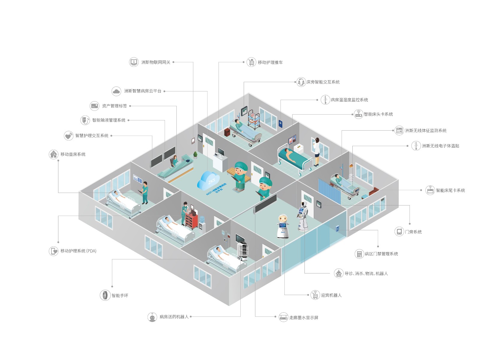 洲斯智慧病房整體解決方案:包括:病房溫濕度監控、體溫等生命體征監測、床旁/床尾/門頭智慧水墨屏、智慧病區人像識別測溫、病房服務機器人、智慧護士站系 統、智慧護理系統、洲斯醫院物聯網平臺等。